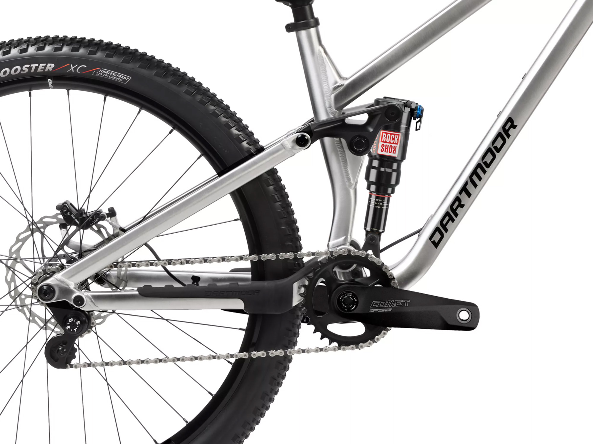 Cockpiten består av Dartmoor Thunder-stem og Lightning Hi-styre, CNC-maskinert for maksimal stivhet og presis kontroll. SRAM DB4-bremser sørger for enkel, pålitelig bremsekraft når du trenger det mest.