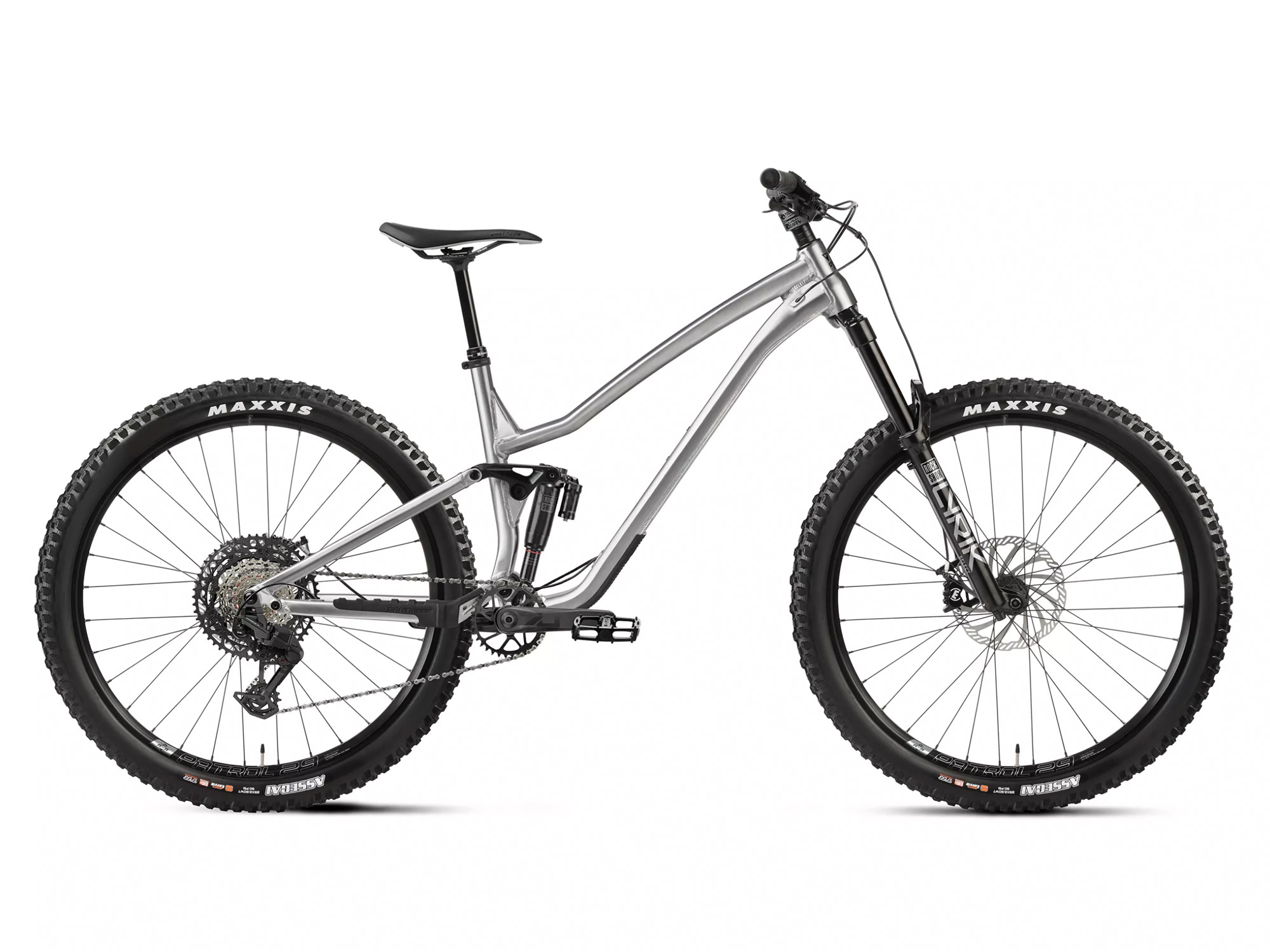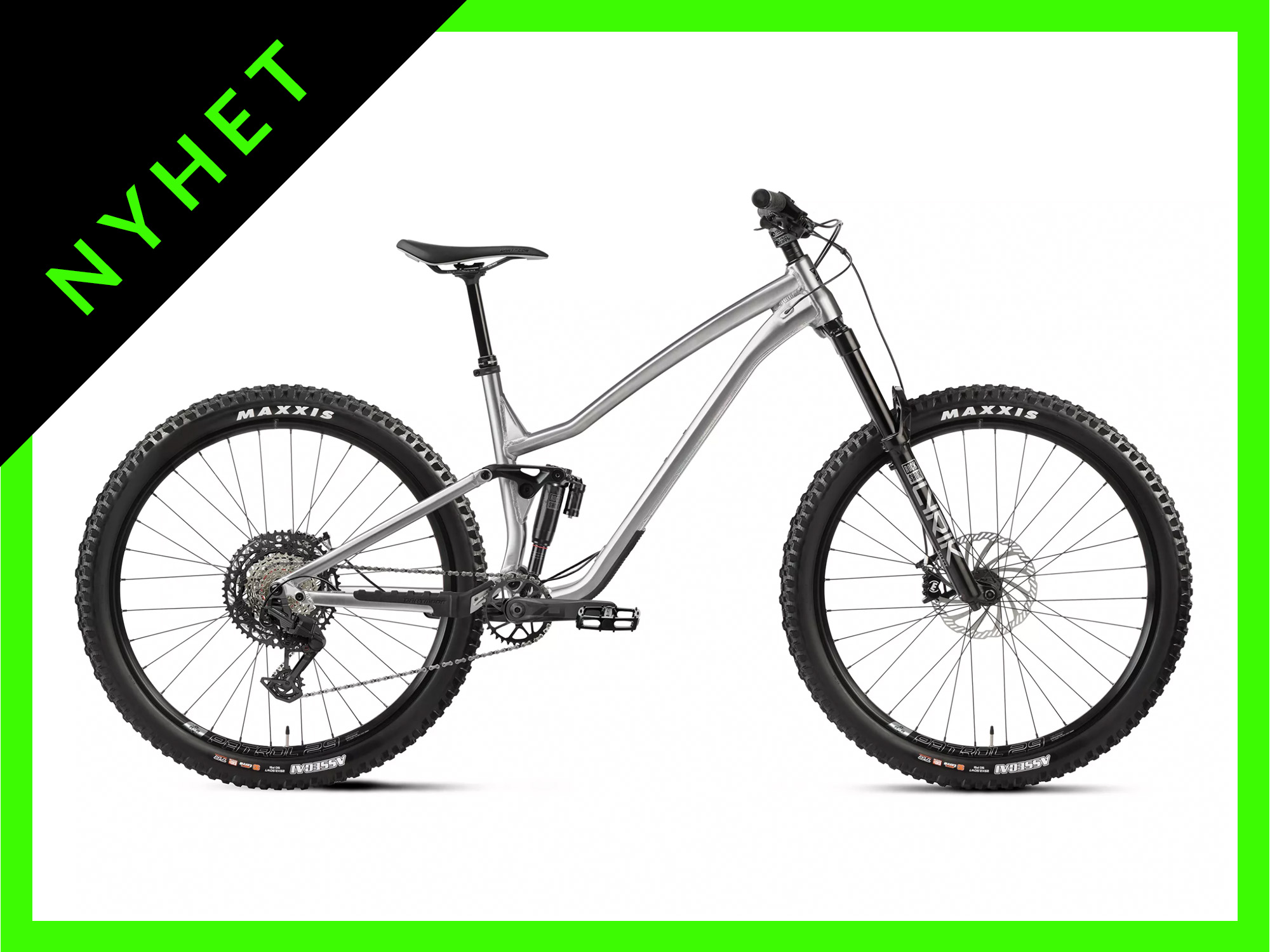 Den nye Rocbird-rammen i Brushed Silver er utviklet med et oppdatert størrelsessystem: størrelser S og M leveres med mullet-oppsett (29” foran / 27.5” bak) for maksimal smidighet, mens L og XL får full 29”-hjul for høyere fart og bedre stabilitet i røffe partier.