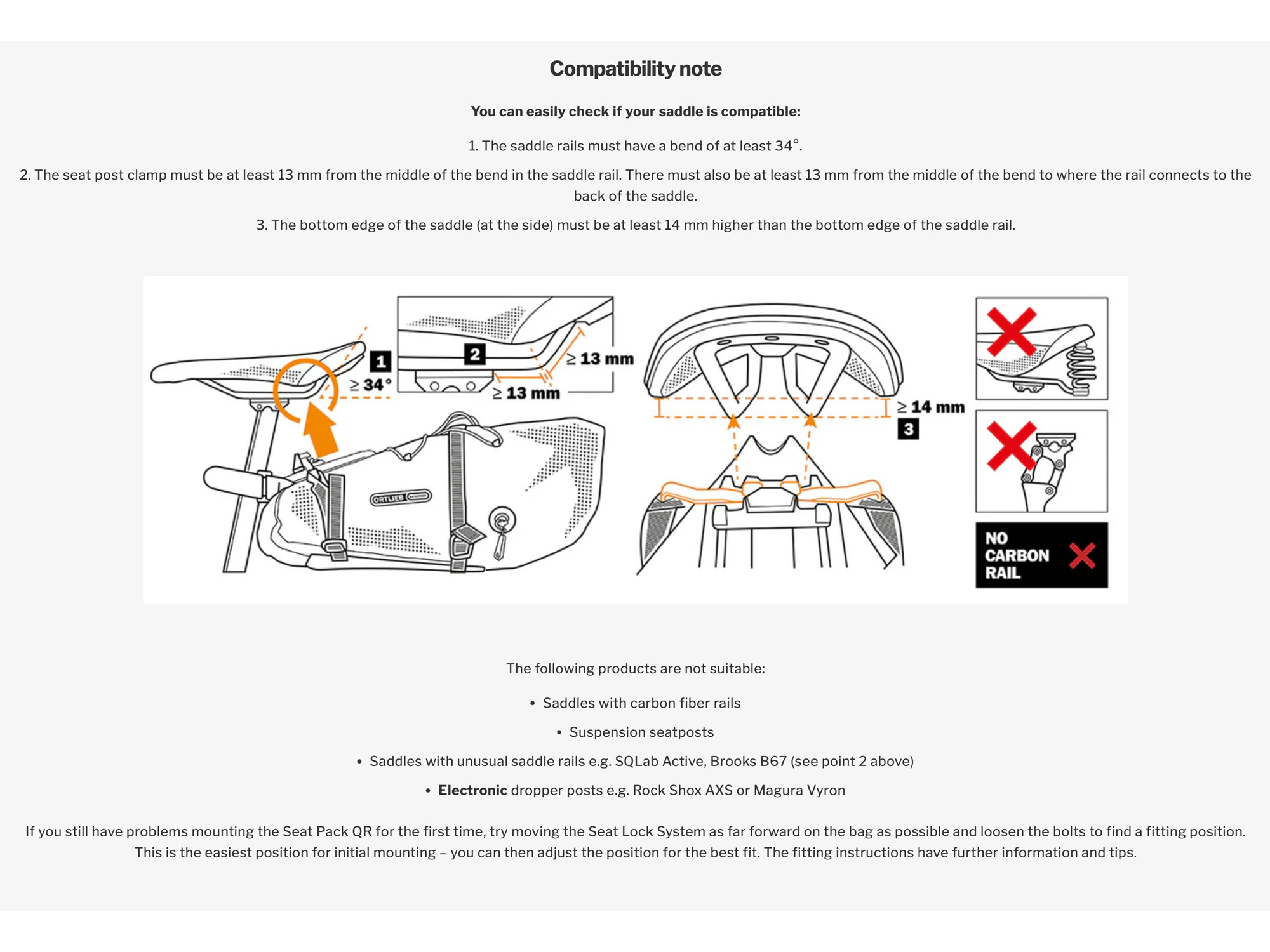 Opplev enkel og sikker montering med Seat-Pack QR, takket være det unike Seat-Lock festesystemet. Vesken kan monteres og fjernes på et øyeblikk, helt uten merker. Med en spesiell adapter på 4.3cm kan den også brukes med dropper-post, noe som gjør Seat-Pack QR allsidig for ulike typer sykler.