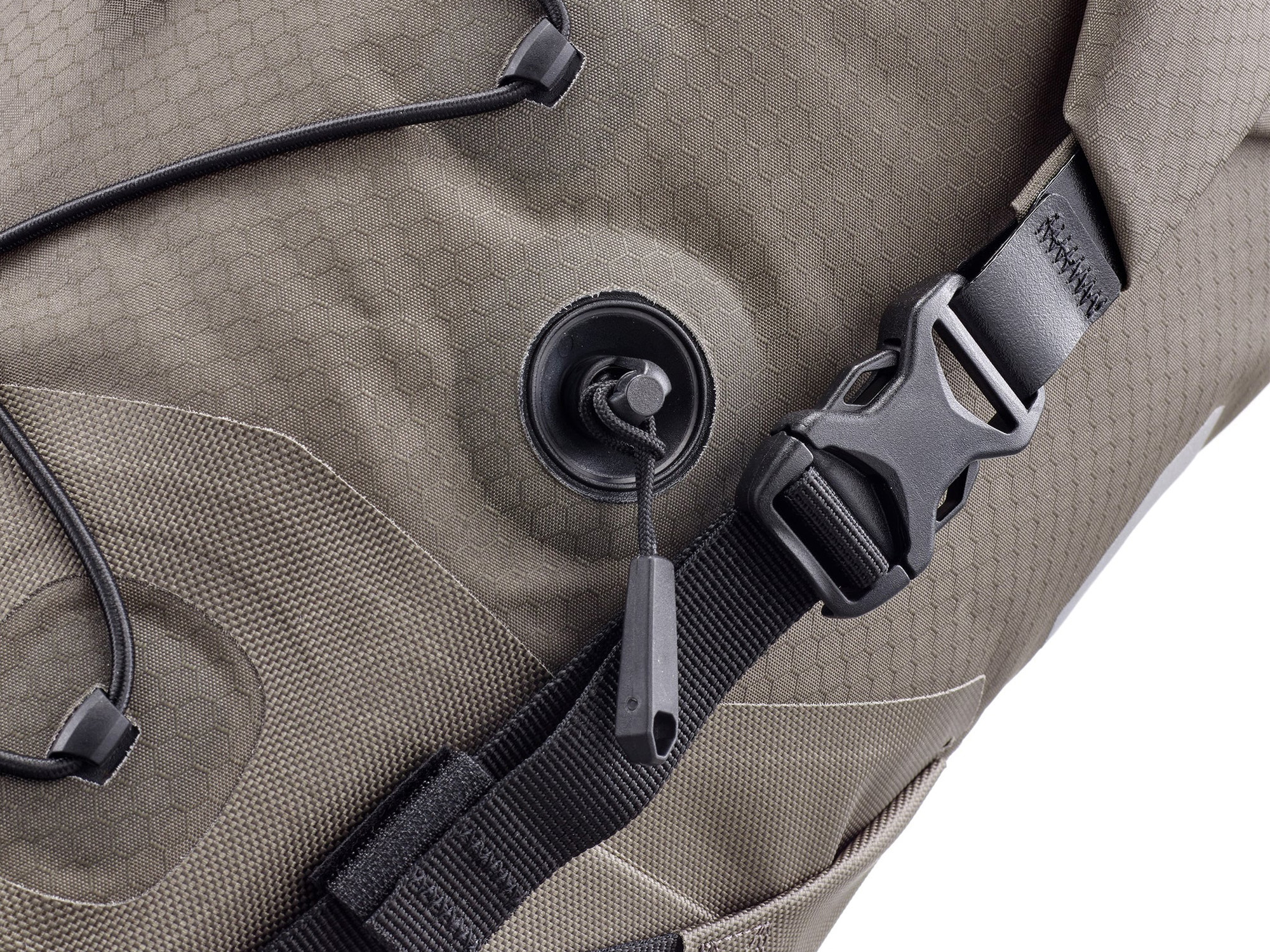 Seat-Pack monteres bak setet og fungerer samtidig som en praktisk bakskjerm mot sprut og smuss. Det romslige hovedrommet holder klær og annet utstyr tørt, selv under tøffe værforhold. Volumet kan enkelt justeres med rullelukking på sidene – 4.5–11l avhengig av behov. Perfekt for både korte dagsturer og lengre ekspedisjoner.